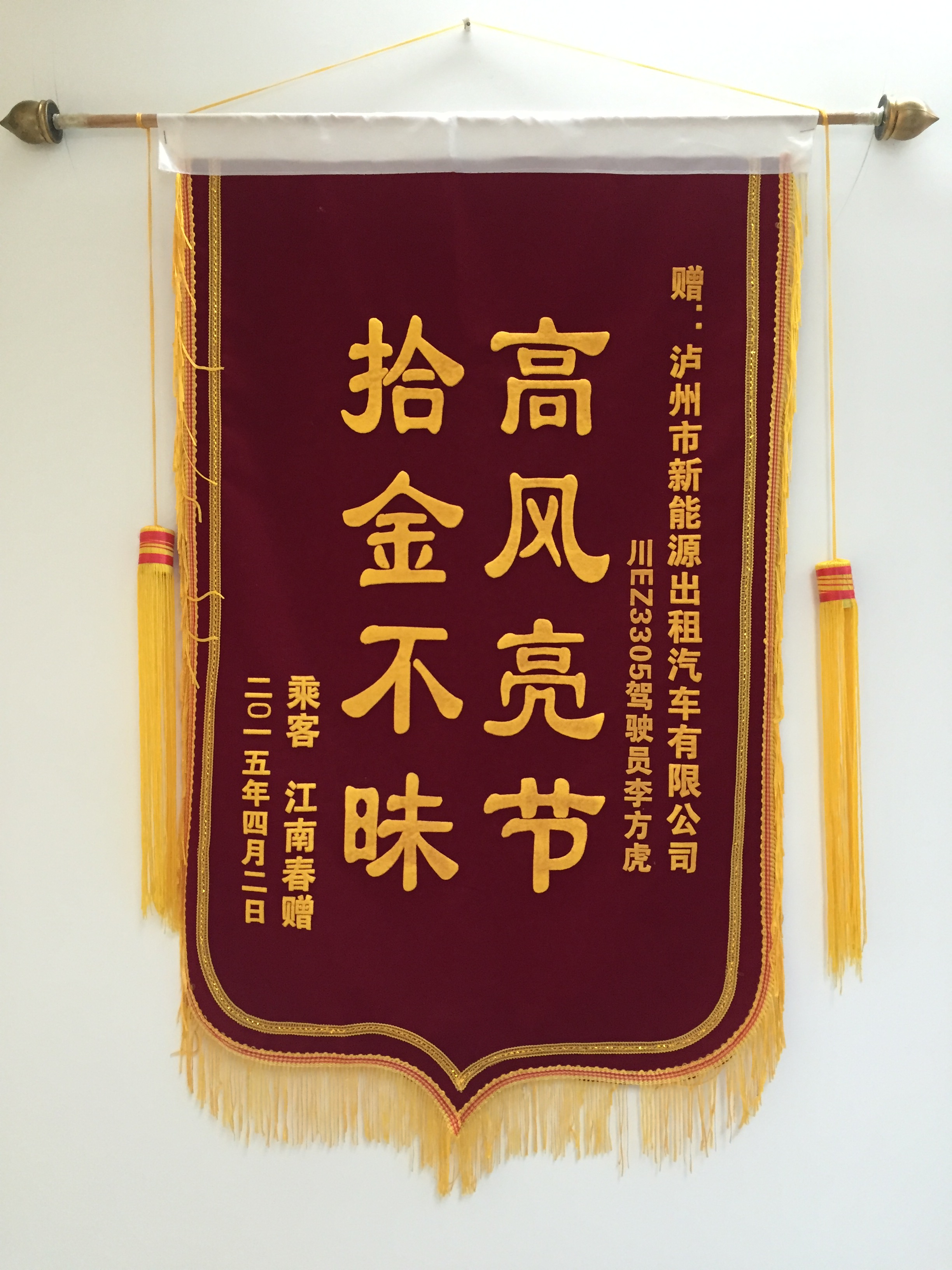 川EZ3305駕駛員李方虎4月1日拾到錢包1個(gè)(內(nèi)有現(xiàn)金1900元、銀行卡數(shù)張)及時(shí)交還乘客,乘客送來錦旗感謝